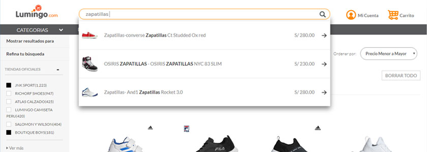 ¿Quieres ir un paso más allá? Tome como ejemplo a Lumingo, que es una de las tiendas online que ah implementado la búsqueda visual con auto completar. Dado que las compras en linea continúan creciendo, esta es una excelente manera de facilitar la búsqueda de productos.